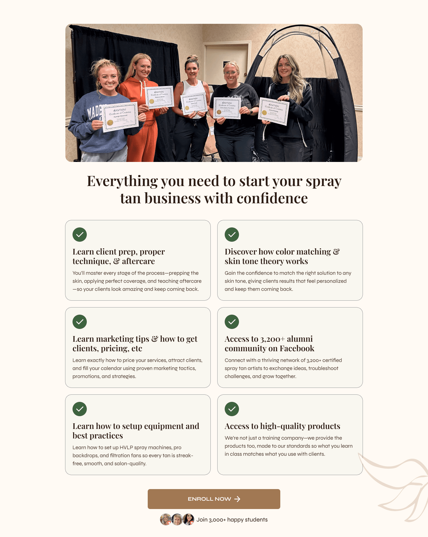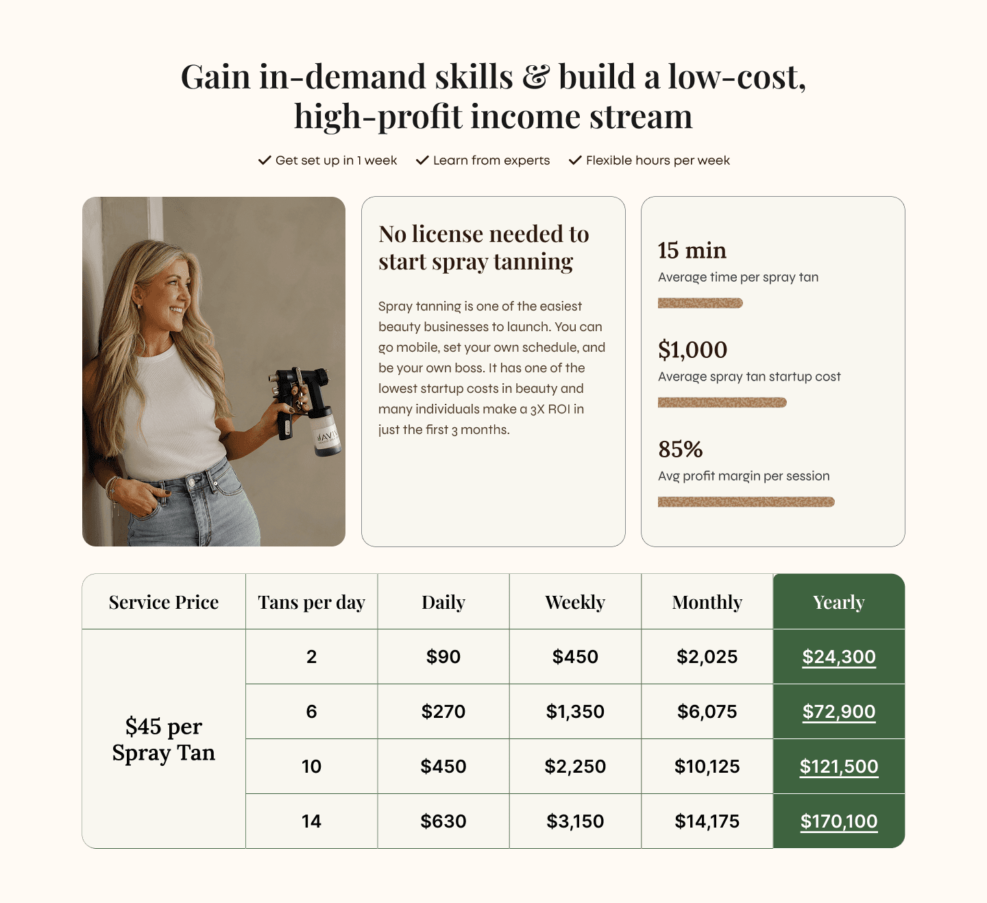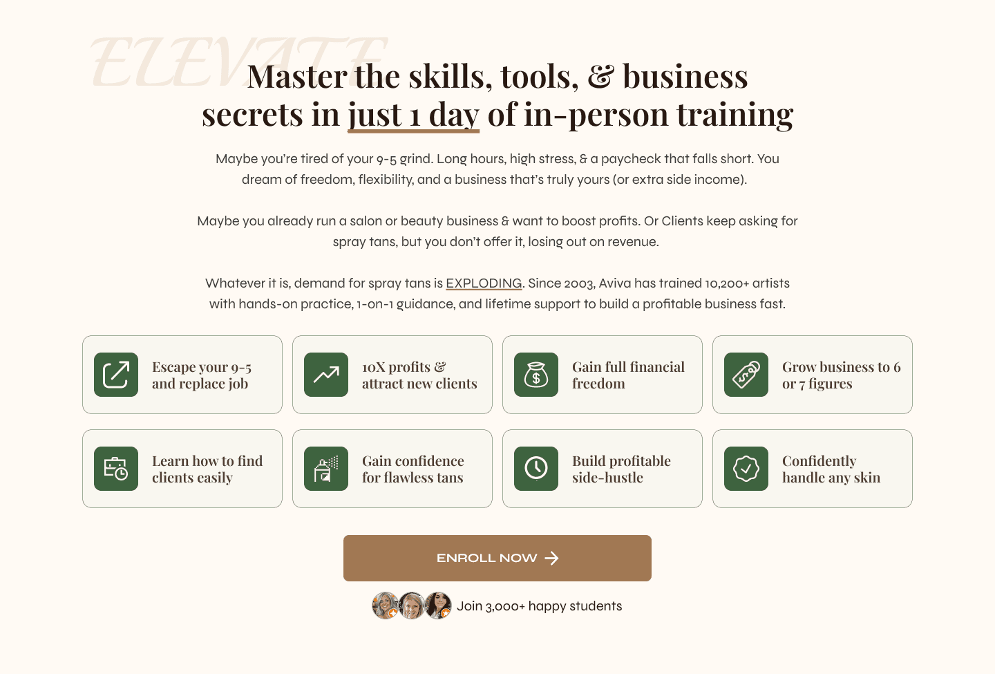 I rewrote the site voice to be clear, straightforward, and benefit heavy. The heroes talk about launching a spray tan business, earning back your class in weeks, attracting loyal clients, and building a reputation with clean formulas.