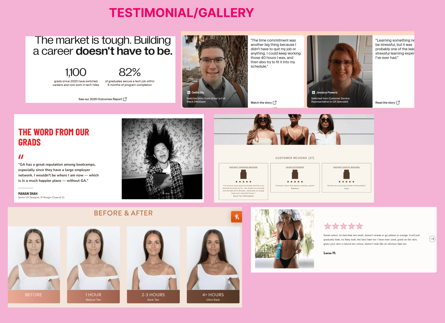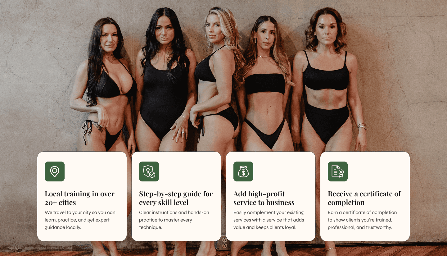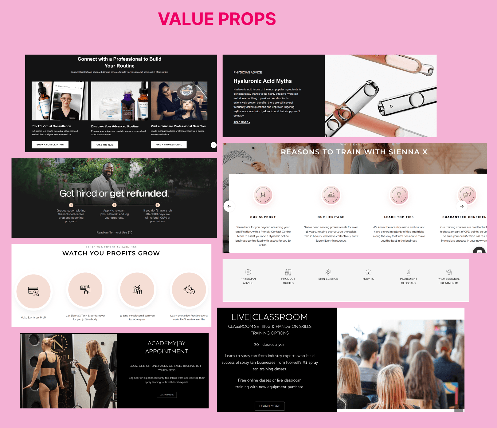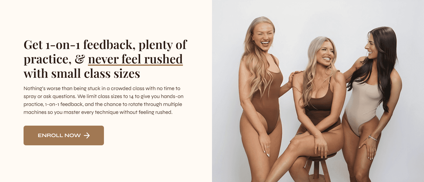 I rewrote the site voice to be clear, straightforward, and benefit heavy. The heroes talk about launching a spray tan business, earning back your class in weeks, attracting loyal clients, and building a reputation with clean formulas.