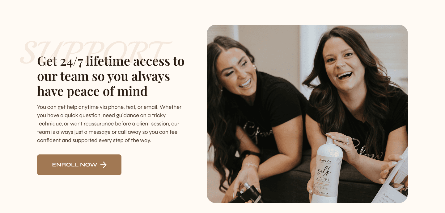 I wrote supporting sections around specific breakdowns of how the formulas, the academy, the support, and the business tools work together. The training sections explain what you actually learn, not just that you get a certificate. The ROI sections show how many clients it takes to pay off a class and how the skill compounds over time.