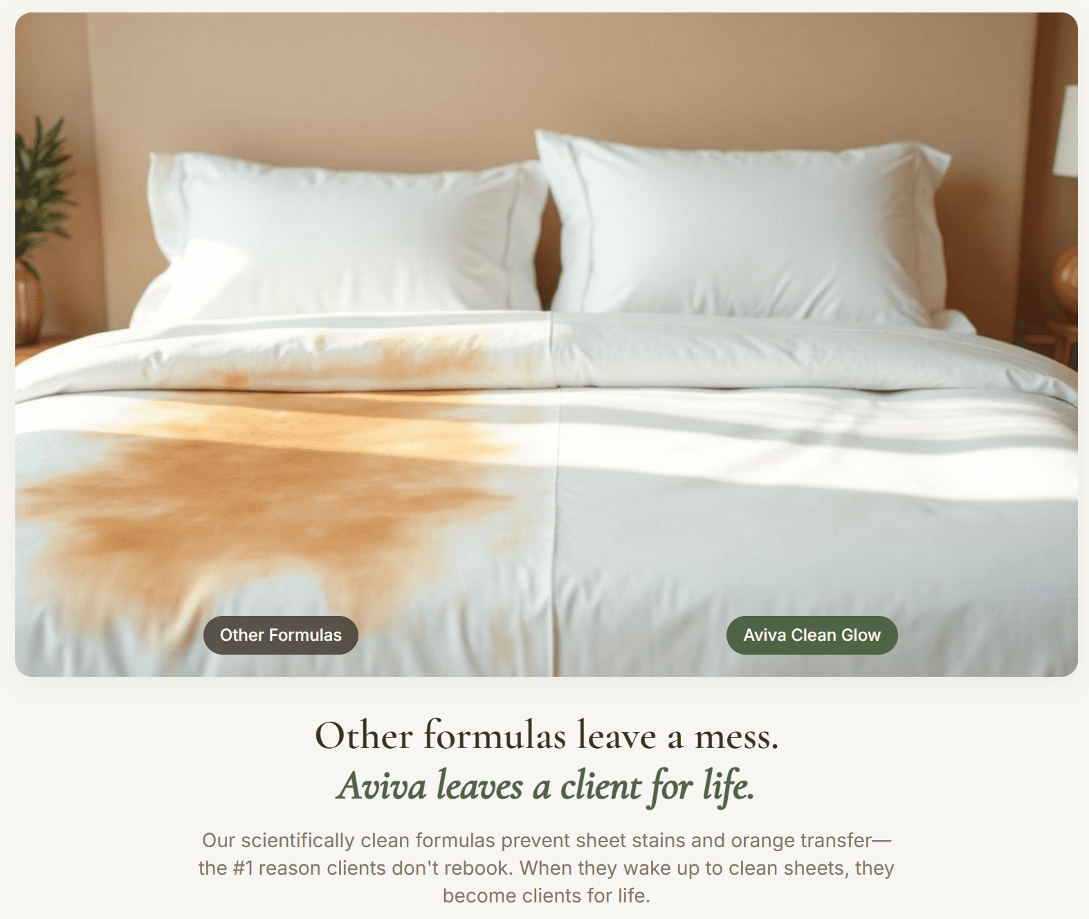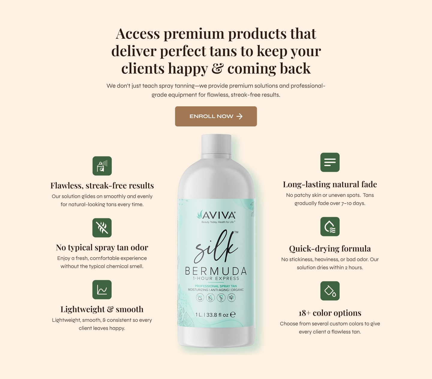 On paper, Aviva has everything a spray tan artist (or artist-to-be) could want in a company. Biotech roots, clean ingredient lists, global distribution, a 20+ years running academy, lifetime support, starter kits, and serious loyalty from professionals. Yet online, that story was diluted.