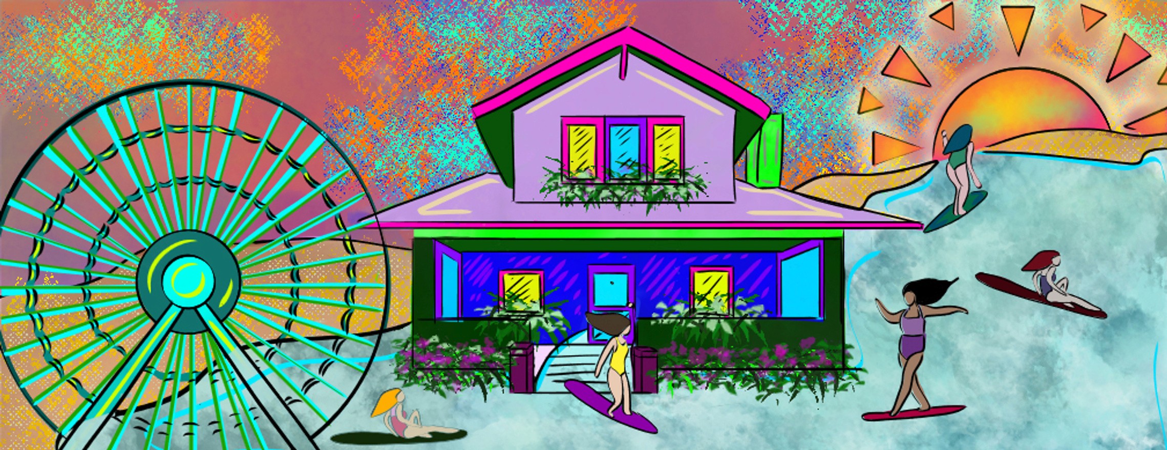 When brainstorming ideas for a mural in a lively and welcoming community like Santa Monica, I chose to depict the lifestyle unique to the area. The mural illustrates a scene overtaking a neighborhood house, with water replacing driveways and sand instead of sidewalks, symbolizing the surfing culture. I placed the giant Ferris wheel where a tree might normally stand, with a sunset backdrop and a colourful home at the center of the illustration.